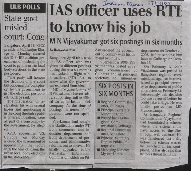 Bangalore, Apr 20 :M.N Vijayakumar's six transfers in six months and his using the RTI Act against the government reported in CNN IBN on 20 APR 07